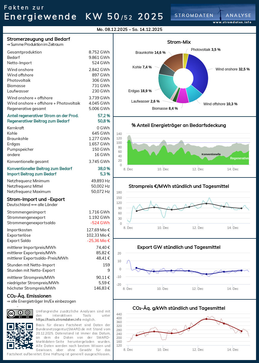 Montag, 8.12.2025 bis Sonntag, 14.12.2025: Anteil Wind- und PV-Strom 46,2 Prozent. Anteil regenerativer Energieträger an der Gesamtstromerzeugung 57,2 Prozent, davon Windstrom 42,7 Prozent, PV-Strom 3,5 Prozent, Strom Biomasse/Wasserkraft 11,0 Prozent.