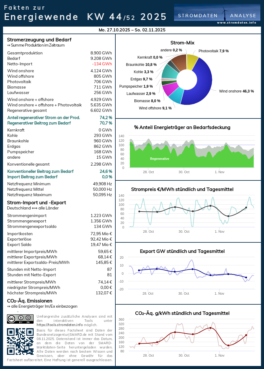 Montag, 27.10.2025 bis Sonntag, 2.11.2025: Anteil Wind- und PV-Strom 63,3 Prozent. Anteil regenerativer Energieträger an der Gesamtstromerzeugung 74,2 Prozent, davon Windstrom 55,4 Prozent, PV-Strom 7,9 Prozent, Strom Biomasse/Wasserkraft 10,9 Prozent.